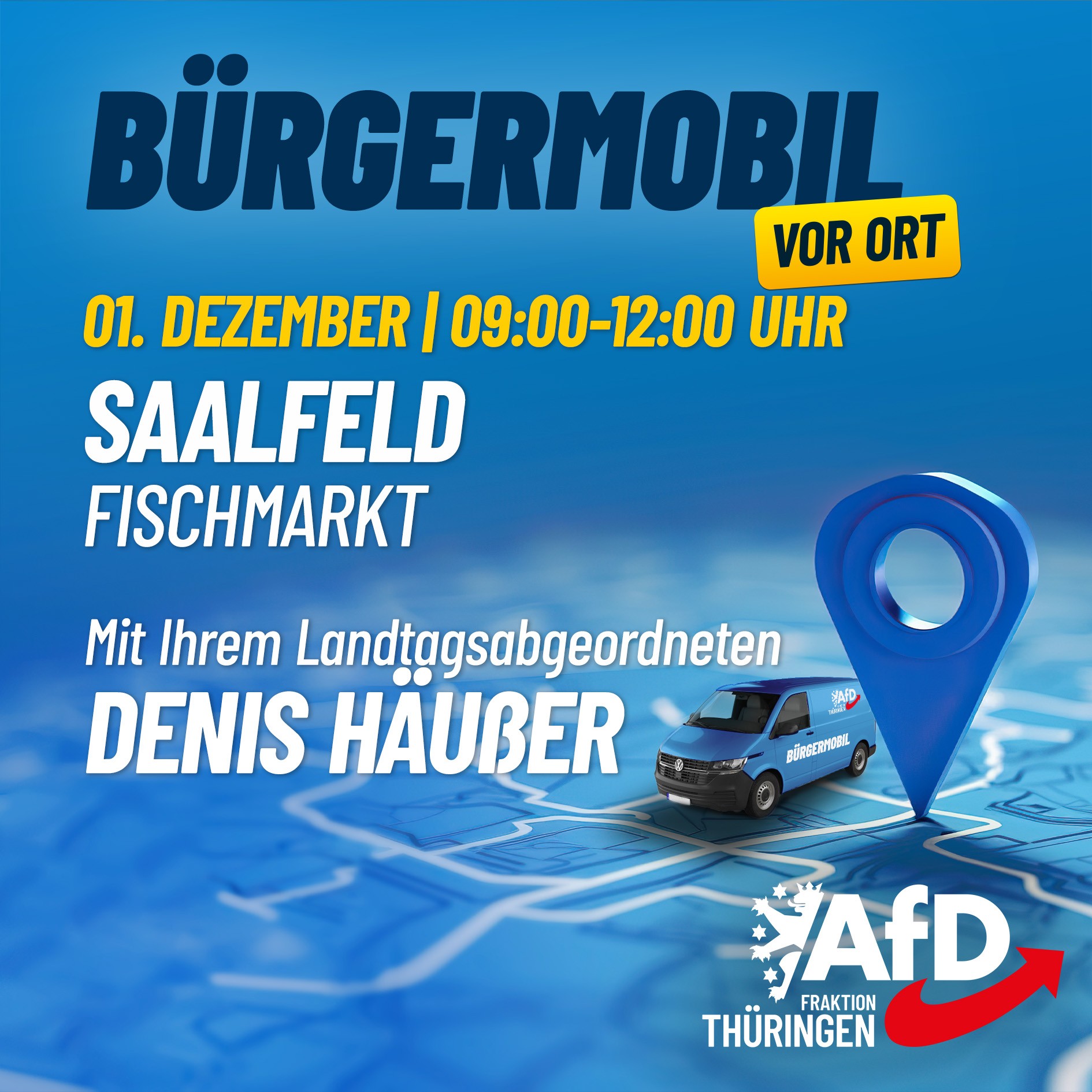 Von 9 bis 12 Uhr stehen wir auf dem Fischmarkt in Saalfeld und freuen uns auf Gespräche und Anregungen. Nutzen Sie Ihren Besuch des Saalfelder Markts und schauen Sie bei uns vorbei – ein kurzer Halt am Bürgermobil lohnt sich immer. Persönlicher Austausch, klare Worte und ein offenes Ohr gehören für uns selbstverständlich dazu. So erfahren wir aus erster Hand, was die Menschen bewegt, und können ihre Anliegen unmittelbar mitnehmen.