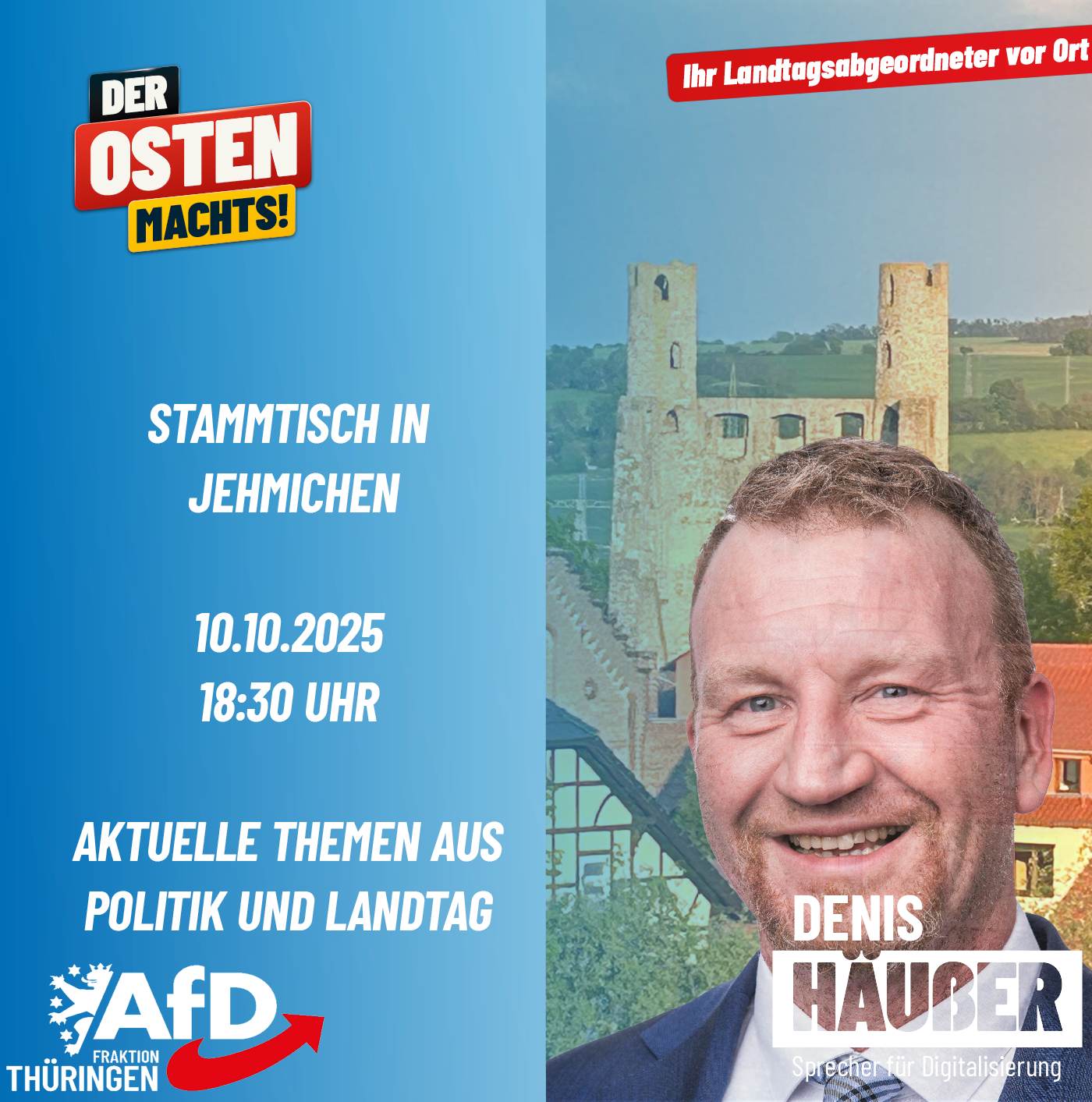 Mein geschätzter Landtagskollege und Mitglied des Landesvorstandes, Dr. Jens Dietrich, wird aufzeigen, was hinter der sogenannten Energiewende tatsächlich steckt – fernab politischer Werbeslogans. Wir sprechen darüber, wie sich explodierende Strompreise, ein zunehmend instabiles Netz, der forcierte Ausbau von Wind- und Solaranlagen sowie das Abwürgen verlässlicher Energiequellen konkret auf unseren Alltag, unsere Wirtschaft und unsere Landschaften auswirken.